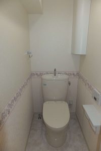 コーナー部分に収納を。帯クロスでやさしいトイレ空間を。