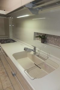 キッチンの壁厚を利用してリビングとおそろいのガラスモザイクを張り込みおしゃれに!!